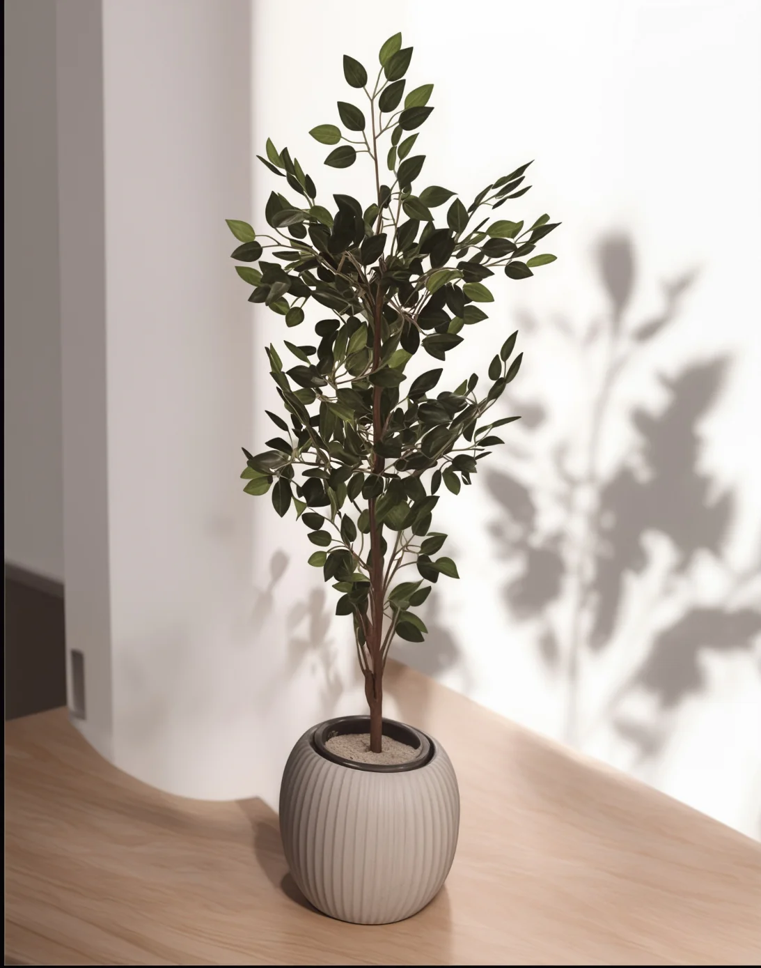 Bring the vibrant tranquility of nature indoors with our **Artificial Leafy Tree in a Textured Pot**. This tall, realistic faux tree, reminiscent of the graceful Ficus Benjamina, is designed to instantly refresh your living space. Presented in a stylish ribbed ceramic pot, it offers a perfect blend of natural beauty and modern design, requiring absolutely no maintenance.