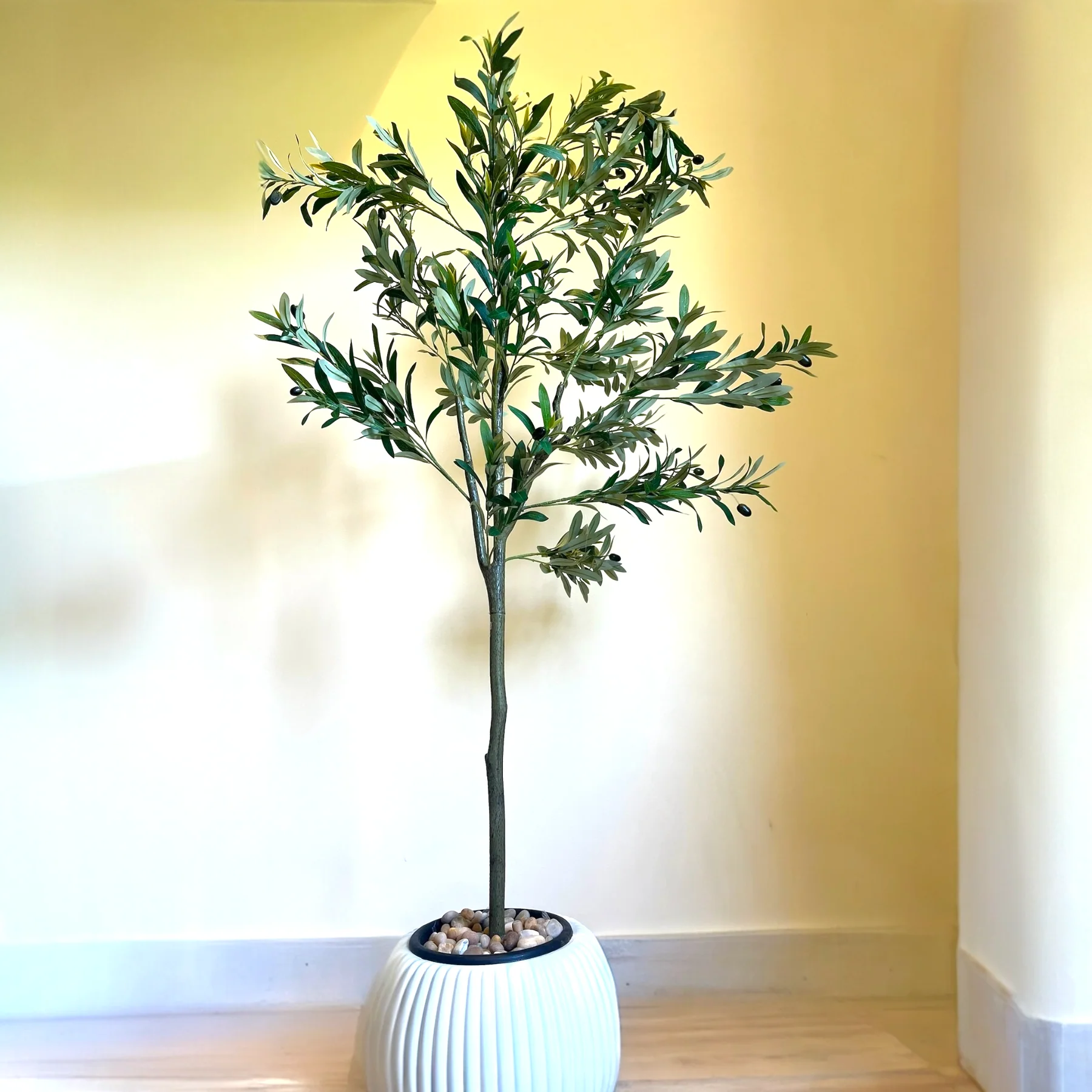 Artificial Olive Tree in White Ribbed Pot: Mediterranean Serenity, Modern Style