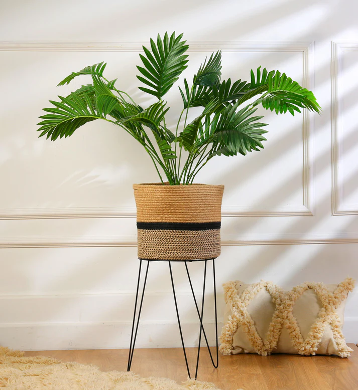 What truly sets this artificial palm apart is its contemporary and eye-catching presentation. The realistic palm fronds are beautifully housed in a natural woven pot featuring a stylish contrasting black stripe, adding a unique textural and visual element. This pot is elegantly elevated by a sleek, minimalist metal hairpin stand, which not only provides sturdy support but also enhances the plant’s height and prominence. This thoughtful combination of natural and industrial elements creates a versatile piece that complements various decor styles, from modern and Scandinavian to bohemian and minimalist.