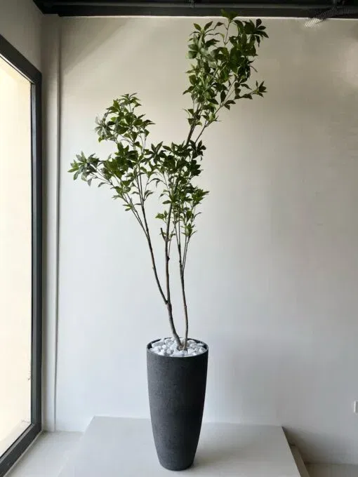 • Minimalist Charcoal Planter: The tree is set in a sleek charcoal grey planter, complemented by crisp white stone accents, adding modern contrast and a sophisticated edge to the overall design.
